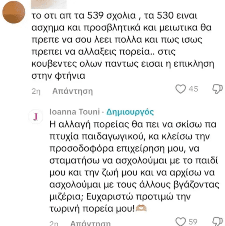 An από τα πιο χαρακτηριστικά αρνητικά σχόλια ανέφερε: «Από τα 539 σχόλια, τα 530 είναι προσβλητικά – ίσως πρέπει να αλλάξεις πορεία».Η Ιωάννα Τούνη απάντησε με καυστικό τρόπο. «Να αλλάξω πορεία σημαίνει να πετάξω όλα μου τα πτυχία στην παιδαγωγική, να κλείσω την επιχείρησή μου ή ακόμα και να παρατήσω το παιδί μου για μιζέρια; Όχι ευχαριστώ».