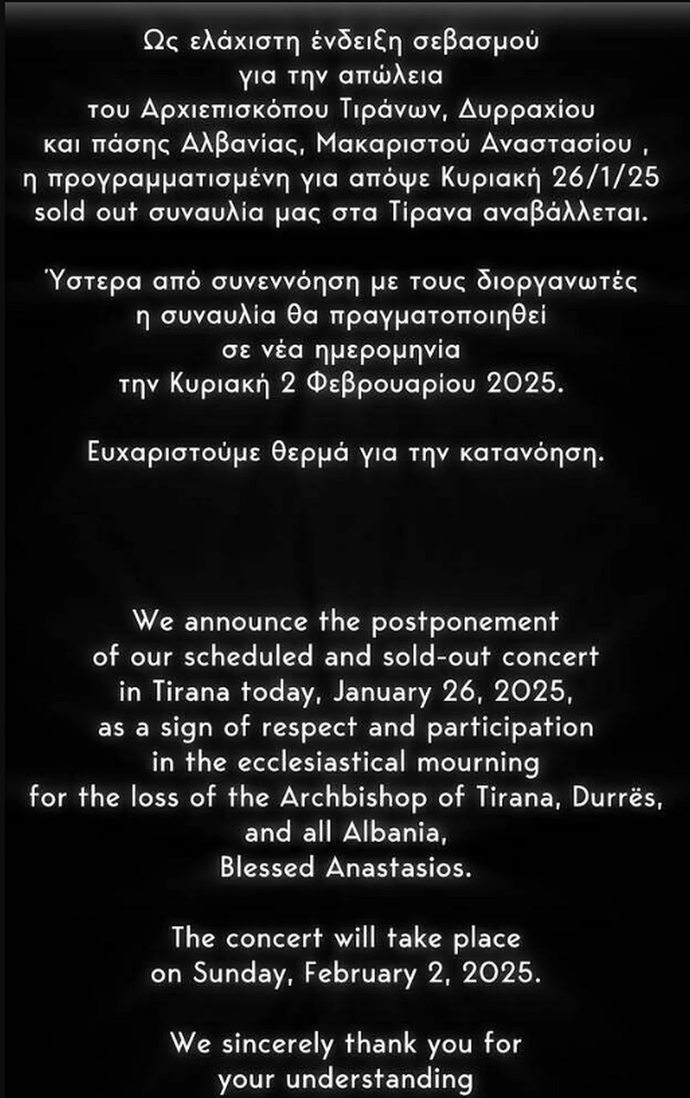 “Ως ένδειξη σεβασμού για την απώλεια του Μακαριστού Αναστασίου η προγραμματισμένη συναυλία μας στα Τίρανα αναβάλλεται.”