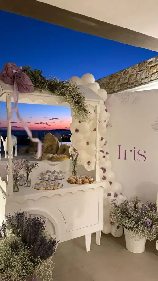 Η τελετή διεξήχθη σε έναν ειδυλλιακό χώρο με θέα προς το Αιγαίο πέλαγος. Η διακόσμηση ήταν ονειρική: λευκά και παστέλ λουλούδια μαζί με γιρλάντες ορχιδέας δημιούργησαν μια ατμόσφαιρα γεμάτη κομψότητα. Η μικρή Ίριδα φορούσε ένα λευκό βαπτιστικό φόρεμα διακοσμημένο με δαντέλες ενώ οι νταντάδες επέλεξαν αέρινες καλοκαιρινές δημιουργίες σε παλ αποχρώσεις που ταιριάξανε τέλεια στο ύφος του μυστηρίου.
